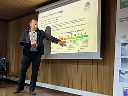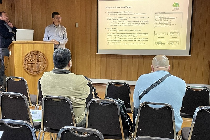 La actividad se llevó a cabo en la Facultad de Ciencias Forestales y Recursos Naturales, donde el Dr. Contreras, director del proyecto y académico del Instituto de Bosques y Sociedad de la UACh, explicó los objetivos del proyecto de dos años de duración, destacando que en este trabajo “se tomaron datos en operaciones de cosecha reales, lo que consistió en el 60% del proyecto. Fue un desafío tremendo, pues la idea es que el resultado tenga una aplicación operativa”, señaló el académico.