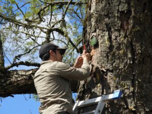 Para el estudio de la presencia de loros en los cultivos, el profesional incorporó un componente bioacústico: 30 equipos que registraron las vocalizaciones de las aves en los predios. “Estos equipos son unidades que se usan para muestrear una gran variedad de especies como, por ejemplo, aves, anfibios o murciélagos, registrando de manera autónoma y por largos períodos de tiempo las vocalizaciones que éstos emiten. Así podemos saber cuánto tiempo estuvieron los loros en los cultivos, a qué hora y si los cultivos donde pasaron más tiempo poseen un mayor daño”, explicó.