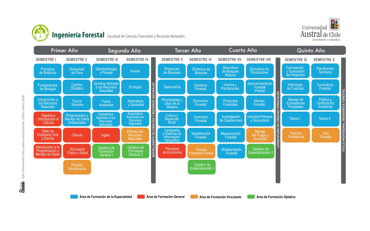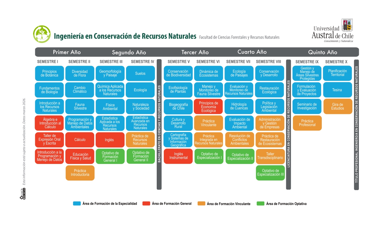 El sistema de ingreso a la carrera de Ingeniería en Conservación de Recursos Naturales - Ingeniería Forestal es mediante un plan común con duración de cuatro semestre, al término del cual obtiene el grado de Bachiller en Ciencias y Recursos Naturales. En el V semestre, el o la estudiante, optará por una de las dos mallas curriculares (Ingeniería en Conservación de Recursos Naturales o Ingeniería Forestal), que le permitirá continuar los ramos disciplinares hasta el X semestre para obtener el grado de Licenciado y el Título Profesional de Ingeniero en Conservación de Recursos Naturales o el de Ingeniero Forestal.